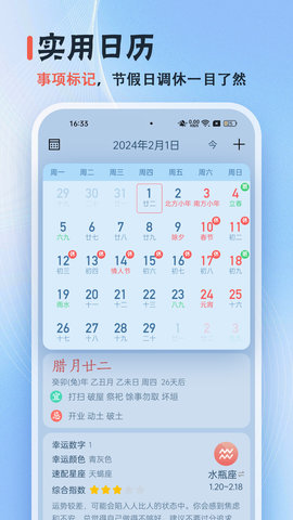 日历无广告还支持日程管理,用户可以添加重要的事务和活动到日历中,设置提醒功能,确保不会错过任何重要事件。用户还可以使用黄历功能,根据黄历宜忌提醒,合理安排生活和工作。记事功能让用户可以随时记录重要的事情和想法,方便日后查看和回顾。