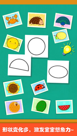 奇妙画板涂涂乐是一款专为儿童设计的益智游戏应用,让孩子们在玩耍中培养想象力和创造力。这款应用的产品特色之一就是可以通过圆形、半圆形、椭圆形等不同形状,变幻出各种可爱的小精灵。孩子们只需用小手指轻轻点一点,这些形状就会瞬间变身,变成害羞的小饼干、顽皮的小刺猬、香甜的大西瓜等等。让孩子们在创作过程中发现惊喜,激发他们的好奇心和探索欲。