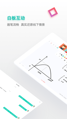 课桌还提供流畅清晰的语音/视频功能,支持多人进行面对面音视频互动。用户可以在互动讨论中使用白板,多人使用画笔、输入文字、上传图片,支持多页滑动无限使用。写字擦除都非常简单易上手,让用户可以随时随地进行互动讨论。