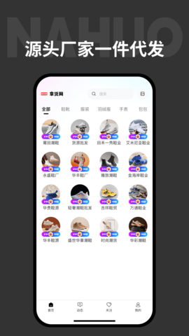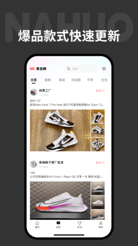 在拿货网上,用户可以找到海量的货源,包括男装、女装、童装、美妆用品、化妆品、手表、莆田鞋、零食、生鲜水果、护肤品等各种热门爆款货源,让用户可以在家就能享受逛批发市场一样的体验。无论您是微商、天猫、京东、淘宝等的电商店铺,还是实体店,拿货网都能满足您的需求。