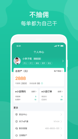 e护通医护端为医护人员提供了一个便捷、安全、灵活的工作平台,让医护人员能够更好地管理自己的工作时间和收入,享受全面的保障和支持。如果有任何疑问或需要帮助,用户可以拨打客服热线4008-933-120,e护通的专业客服团队将随时为您提供支持和解答。