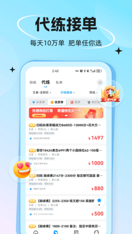 代练丸子是一款游戏交易、代练陪玩应用,已经累积注册了上千万用户。作为一家专注于为用户提供优质、高效、快捷、安全游戏代练/陪练服务的平台,代练丸子为广大玩家提供了一个便捷的上分渠道。不仅可以通过代练丸子找到专业的大神代练,提升游戏技术水平,还可以在闲暇时间轻松接单,实现赚钱的目标。
