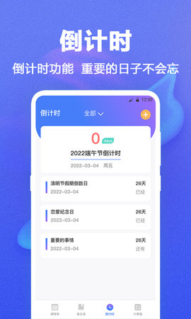 除了课程表和日历功能,课程表还提供了倒数日功能。您可以设置重要日期和事件,自定义个性化背景,让倒数日成为您高效时间管理的神器。无论是倒数到考试日、生日还是重要会议,倒数日都能帮助您时刻关注重要事件的倒计时。