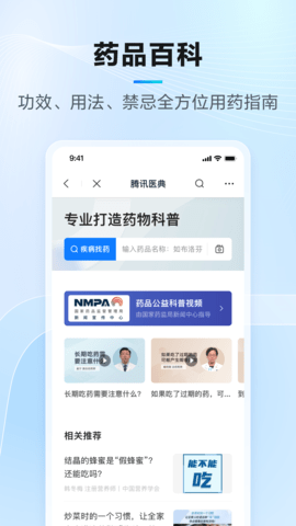 腾讯医典是一款集问诊咨询、健康自测、用药查询、名医直播、在线问诊等多种功能于一体的健康应用。用户可以通过健康自测功能进行全面评估自身健康状况,了解自己的身体状况并及时调整生活方式。用药查询功能提供权威、全面、更新迅速的药物信息,帮助用户了解药物的相互作用、不良反应等细节数据。
