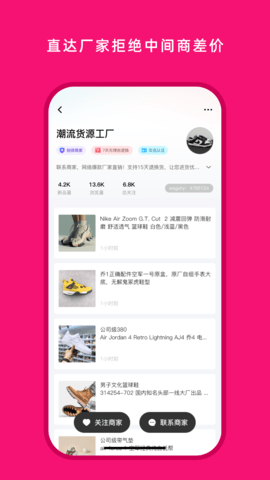在货源之家,用户可以找到海量的货源平台,各种热门爆款货源任用户挑选,包括男装、女装、童装、美妆用品、化妆品、手表、莆田鞋、零食、生鲜水果、护肤品等。无论您是微商、天猫、京东、淘宝等电商店铺的经营者,还是实体店的老板,都能在货源之家找到满足自己需求的货源。入驻商家可以自行发布商品,直接面向厂家进行找货批发,公开多种联系方式,无障碍直接沟通,实现点对点的商家联系,没有任何服务费用,拒绝中间差价。