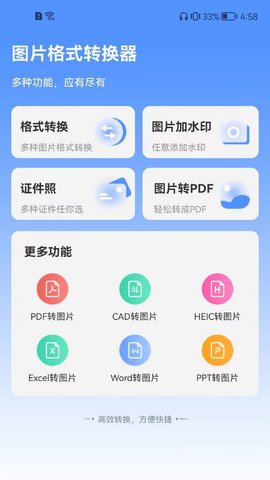 全能图片格式转换器是一款办公应用,具有专业实用的特点。它支持多种图片格式转换,包括jpg、png、bmp、lcon和pdf。它还支持将pdf文件转换为图片,以及将word、excel、ppt、tif和heic文件转换为图片。除了基本的格式转换功能外,全能图片格式转换器还提供了许多其他实用的功能,如抠图、图片尺寸调整、图片裁剪、证件照制作、拼图等。