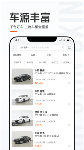 优信二手车是一款非常实用的汽车交易应用,它为用户提供了多种便捷的购车方式。优信二手车拥有庞大的线下卖场,总面积达到万平方米,每个卖场都有上千台优质二手车等待用户来试驾。无论您是想亲自去看车试驾,还是想通过线上购买,优信二手车都能满足您的需求。
