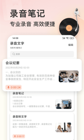 录音机是一款手机辅助应用,能够实现录音转文字功能。它支持后台录音,用户可以在录音过程中暂停,继续录音,非常方便。这款应用还可以用于课堂笔记,用户可以拍照和录音,方便复习和记录重点内容。它支持外部导入录音并转写文字。