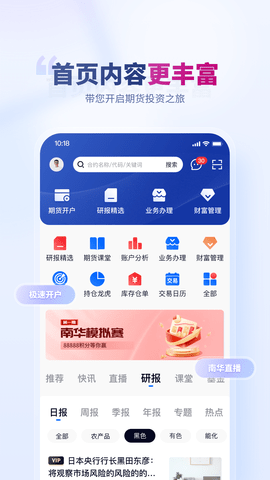 南华期货通APP的特色功能包括手机自助快捷开户,投资者可以随时随地通过手机进行期货开户,享受7*24小时资深投顾的1对1服务。投资者还可以通过服务热线0571-81727119获取更多投资建议和咨询。南华期货通还提供定制期货研报支持,多维度数据结构,帮助投资者分析期货行情走势,做出更明智的投资决策。