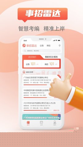 事招雷达是一款专注于事业单位编制考试信息整合与服务的移动应用软件通过技术手段将分散于全国各地人社部门、人事考试网及各级招考单位的招聘公告、动态通知进行系统性采集、清洗与聚合,为庞大的备考群体构建了一个实时、清晰、一站式的信息中枢,的核心用途在于彻底改变传统备考中信息搜集耗时费力、渠道繁杂、容易遗漏的局面不仅实现了对招聘岗位的快速检索与多维度条件筛选,更将报名流程中的资料准备、信息填写、资格初审乃至缴费确认等环节进行了深度的移动化整合与简化,使得从初始的信息探测到最终完成报考的完整闭环都能在智能手机上流畅完成,从而显著提升了备考与应试的整体效率和便捷性,成为考生在激烈竞争中的得力数字化助手。