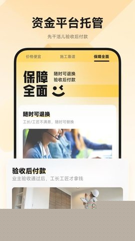 资金托管与分阶段支付:用户将合同总款存入平台合作的第三方支付机构托管账户。根据合同约定的里程碑(如拆改完成、水电验收、整体竣工),业主在APP内确认后,相应款项才会自动划转给服务方,确保工程与付款同步。