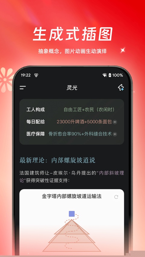 灵光是一款融合了语言、图像与语音多模态理解与生成能力的智能助手应用,通过直观生动的可视化内容呈现,革新信息获取与创作体验。用户仅需输入关键词或问题,即可获得涵盖图表、地图、动画、插图乃至3D模型的丰富响应,高效服务于办公、学习与生活场景,将抽象知识转化为可感知的互动内容。