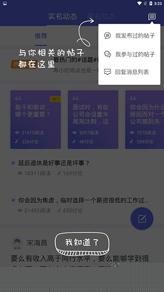 2、【职圈】:这里就相当于是一个小型的社区交流论坛,当然都是关于职场和工作方面的内容,右上角还可以查看与我相关的内容。