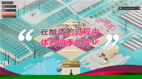 宁静治愈且富有艺术感的美术与氛围营造。游戏采用简约而精致的手绘风格,画面色彩柔和,细节丰富。玩家可以清晰地看到葡萄园随着游戏内季节更迭而发生的变化:春日新芽萌发,夏日绿叶成荫,秋日果实累累挂满枝头,冬日藤蔓休眠覆盖薄雪。酒庄的建筑、远处的山峦、天空的光影都随着时间流转,共同营造出一种远离喧嚣、专注于创造的田园诗意氛围,让经营模拟的过程本身成为一种视觉与心灵上的享受。